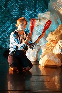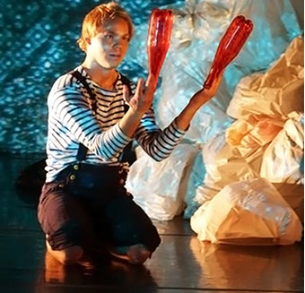 As a performer and creator in the show L'ïle de Pléthore in the company Cie la Manoeuvre 2015-2017 in France. It is a contemporary circus performance aimed at the young public, which deals with the materialistic throwaway culture of modern society. The world of the show is built with trash, disposable items, plastic bags, old toys and the world is illustrated by projectors.